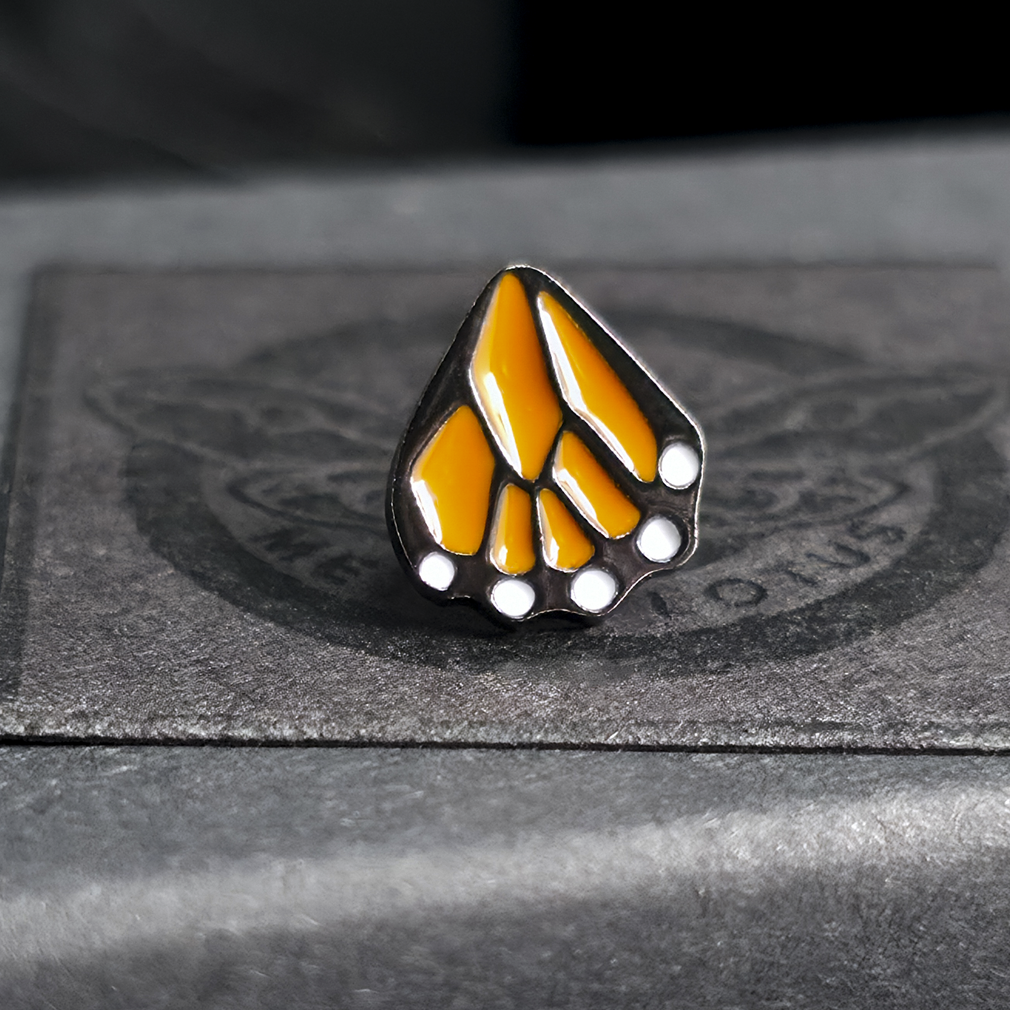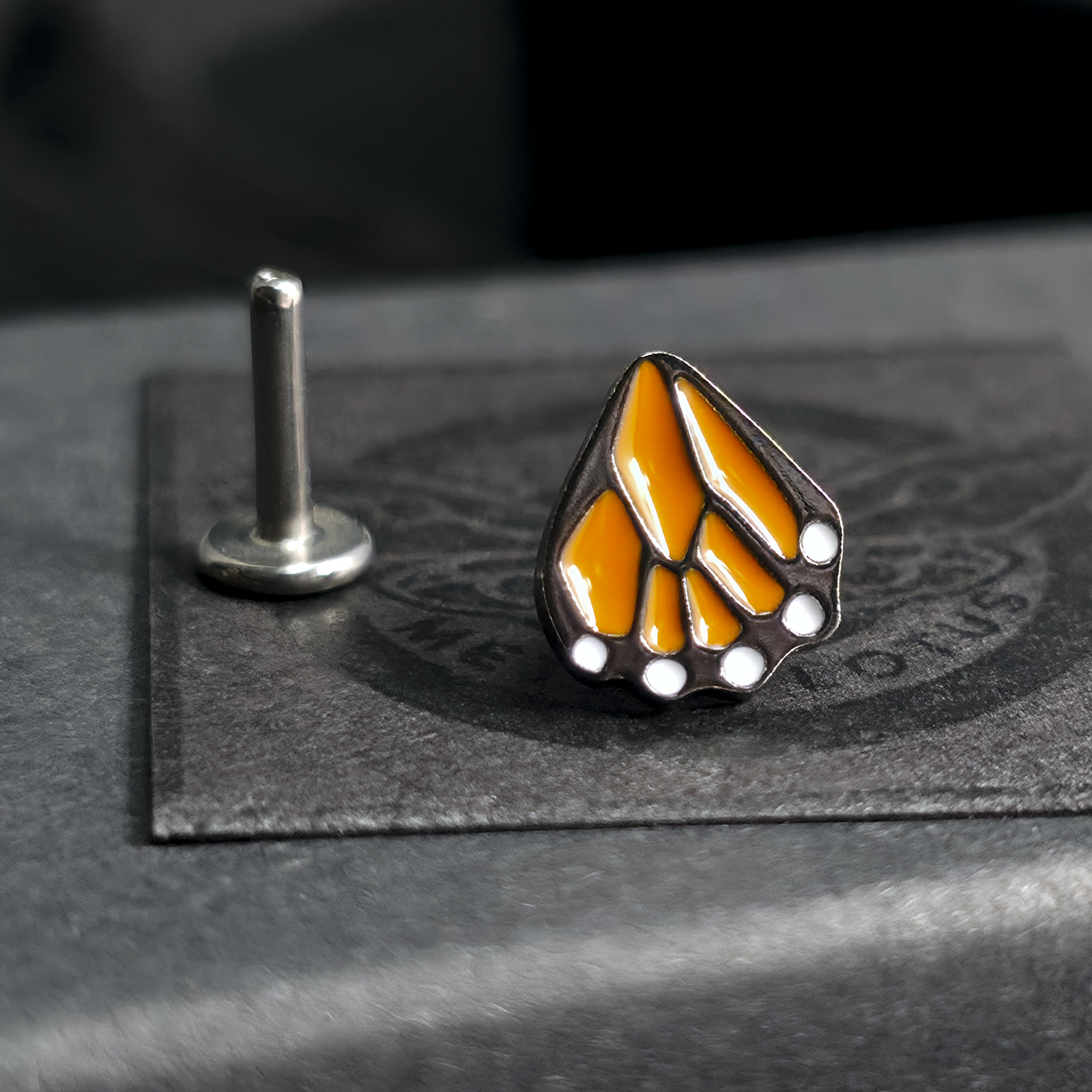 This tiny monarch butterfly hindwing design features delicate orange and black details, paired with a titanium backing for comfortable wear. The threadless top is crafted out of sterling silver and soldered to a tiny 316L steel pin for durability. Plated with a ceramic e-coating. It’s built to last (and to be stared at).