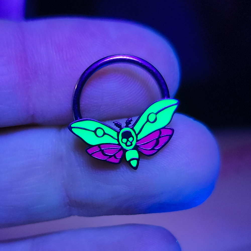 Glow in the dark designs on a titanium hoop. One ring, four ways to wear it! Septum, daith, helix, or conch. Nickel-free + simple to use.