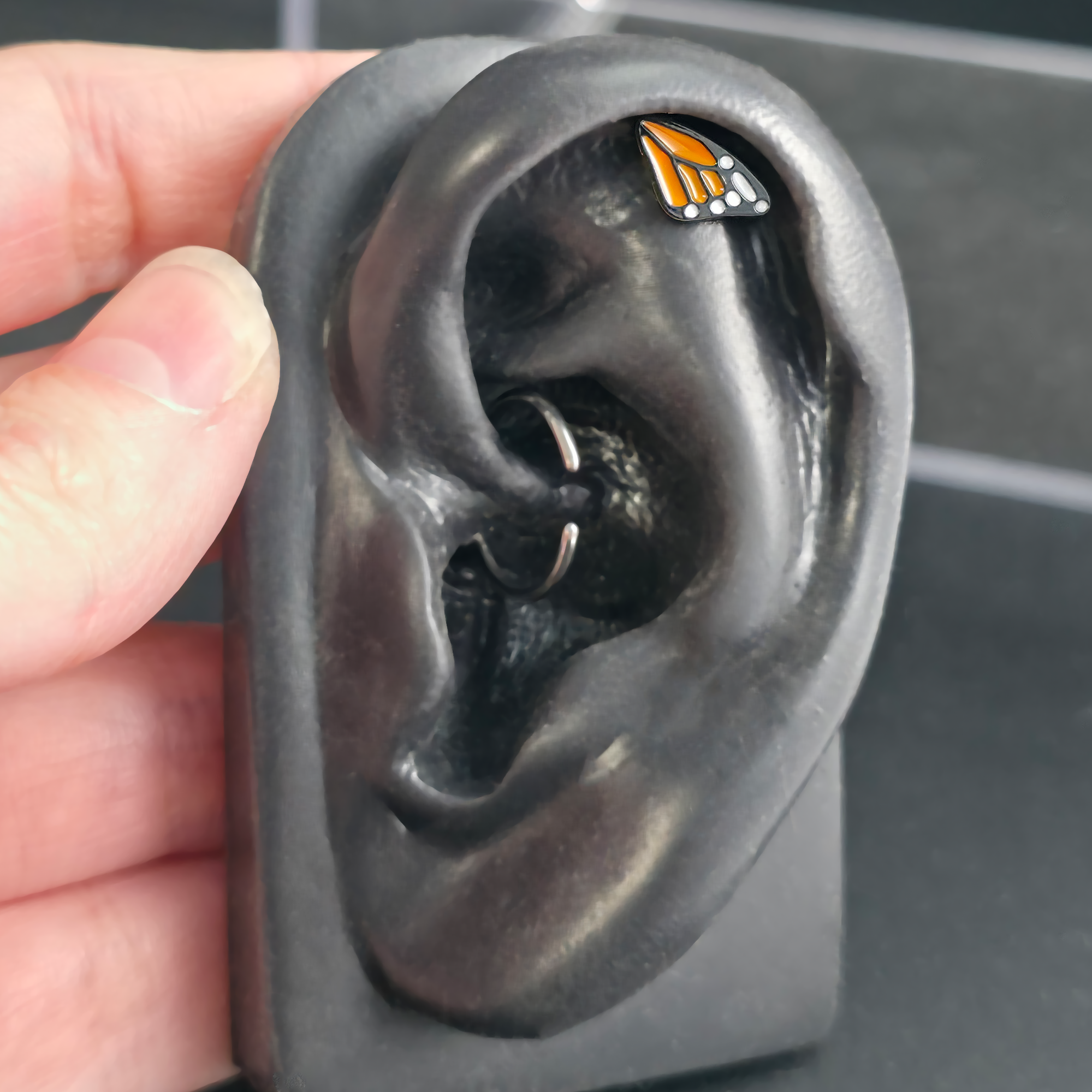 This tiny monarch butterfly wing design features delicate orange and black details, paired with a titanium backing for comfortable wear. The threadless top is crafted out of sterling silver and soldered to a tiny 316L steel pin for durability. Plated with a ceramic e-coating. It’s built to last (and to be stared at).