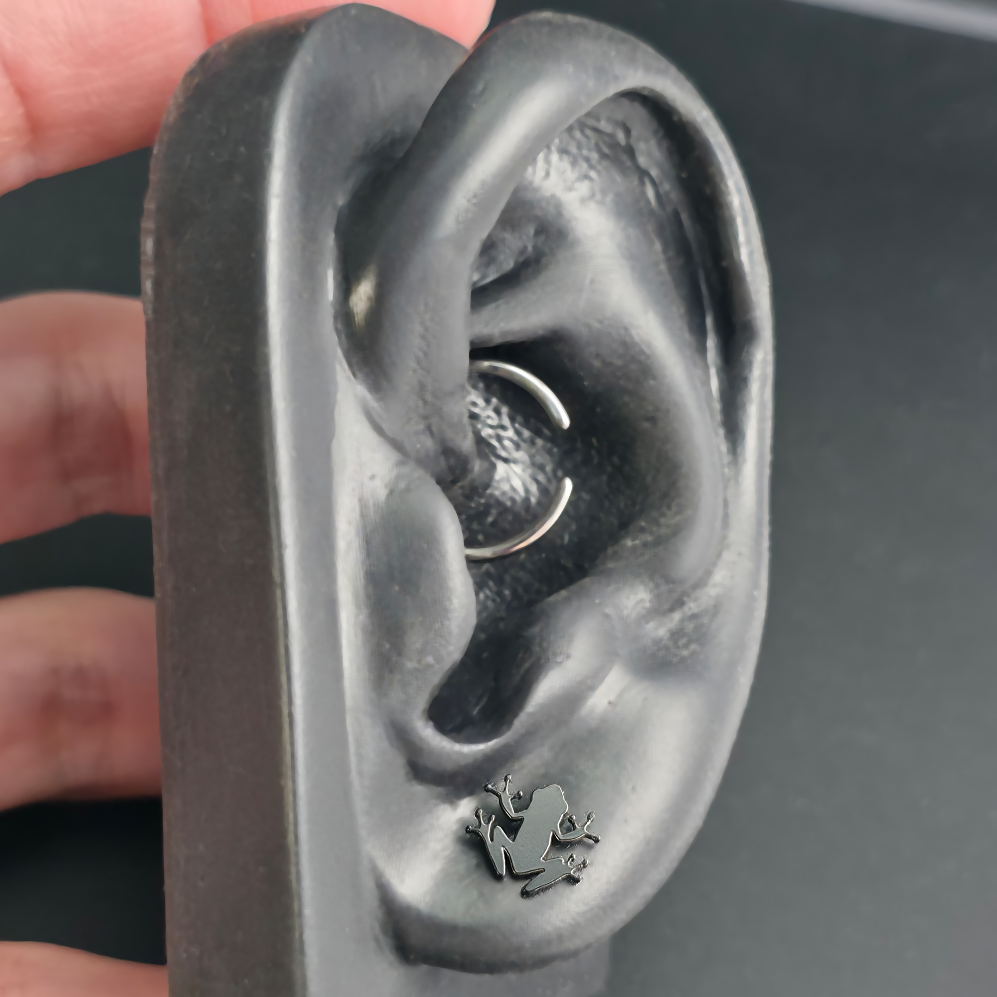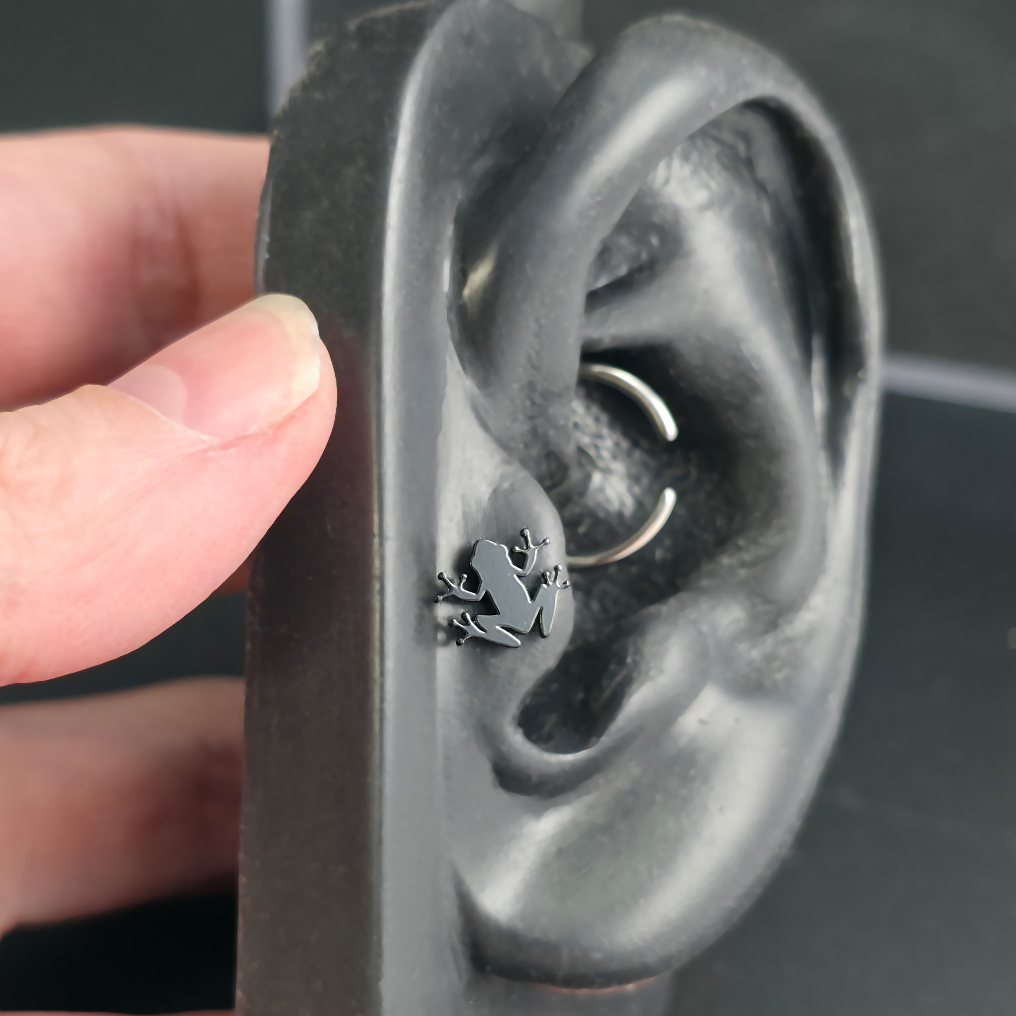 This tiny tree frog silhouette design features delicate black details, paired with a titanium backing for comfortable wear. The threadless top is crafted out of sterling silver and soldered to a tiny 316L steel pin for durability. Plated with a ceramic e-coating. It’s built to last (and to be stared at).