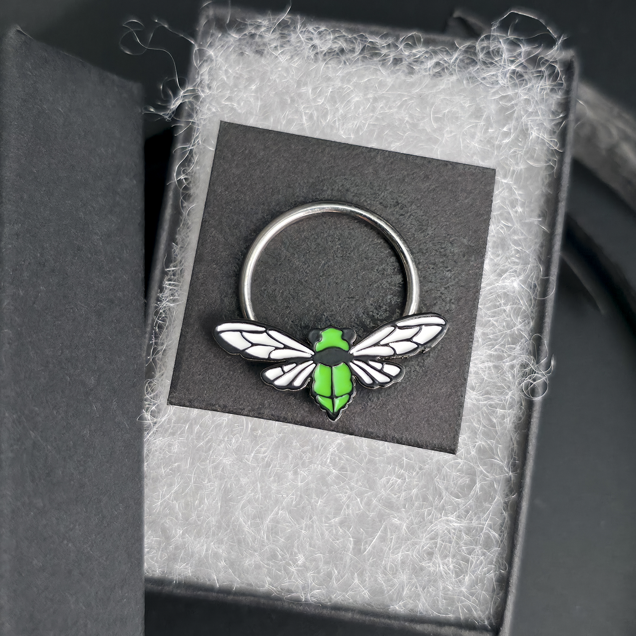 Wear it as a reminder you can always start again. This cicada design features black and green details, paired with a titanium hoop for comfortable wear. Crafted one at a time in sterling silver and plated with a ceramic e-coating, it’s built to last (and to be stared at).