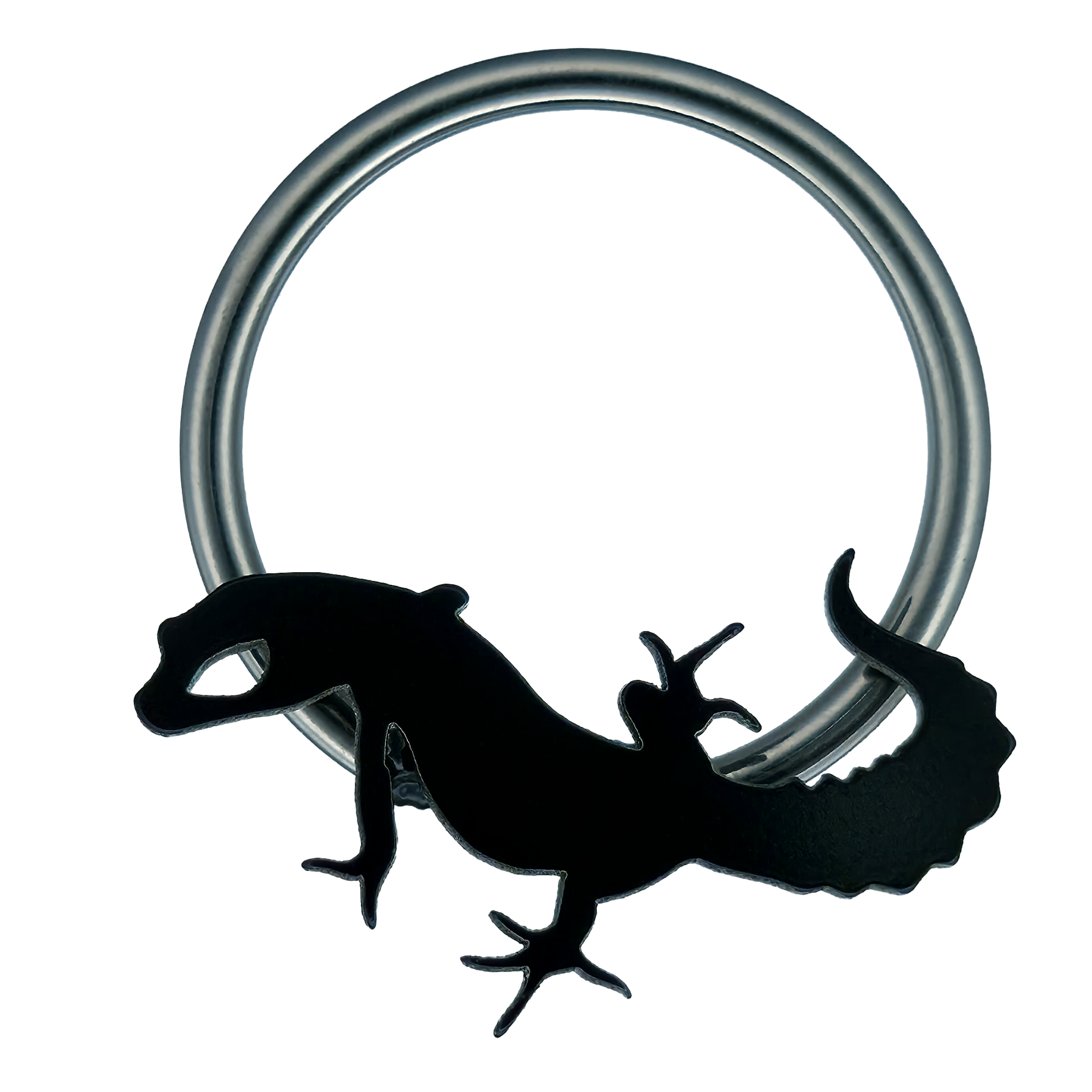 This leopard gecko design features solid black details, paired with a titanium hoop for comfortable wear. Crafted one at a time in sterling silver and plated with a ceramic e-coating, it’s built to last (and to be stared at).
