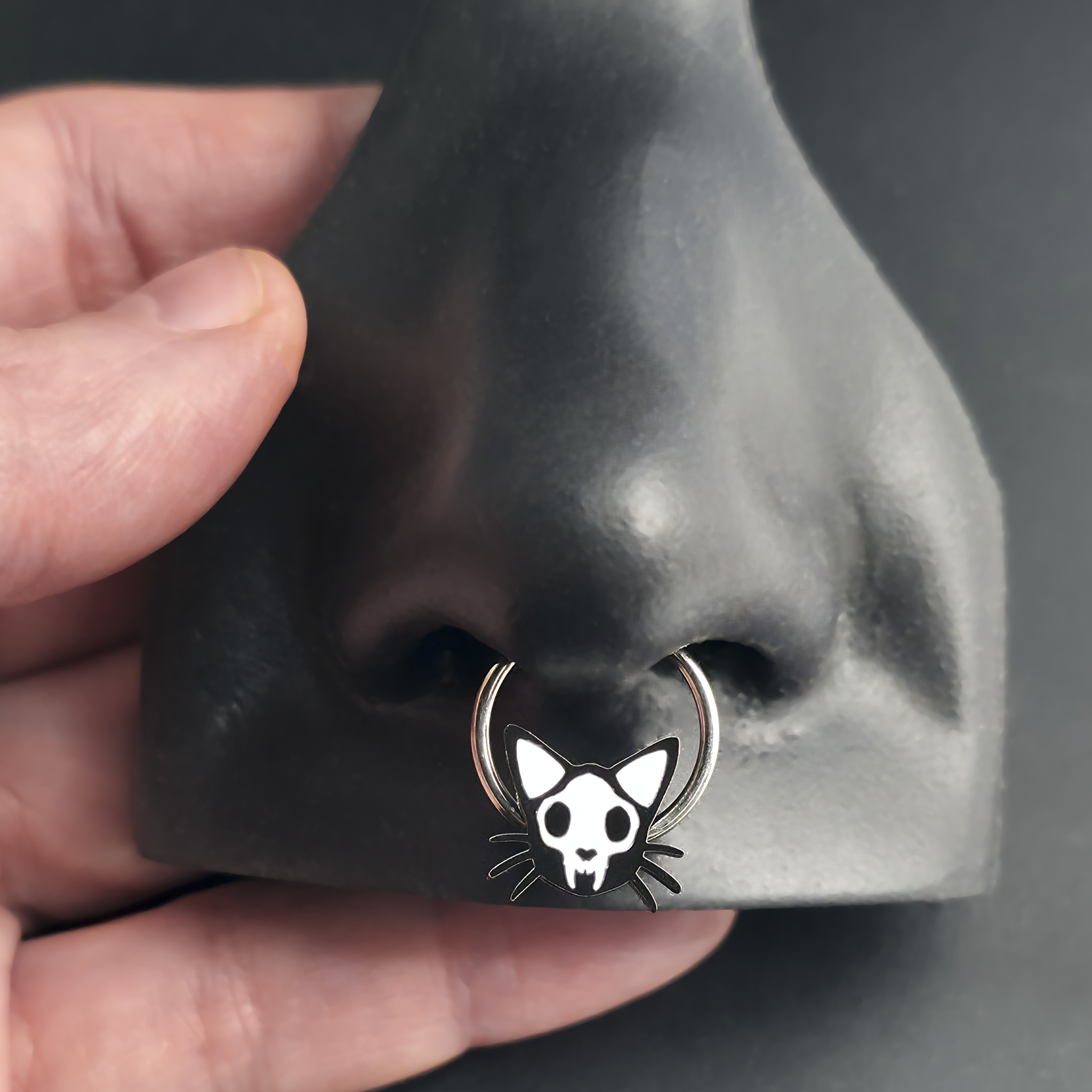 For the spooky cat people. This cat skull design features black and white details, paired with a titanium hoop for comfortable wear. Crafted one at a time in sterling silver and plated with a ceramic e-coating, it’s built to last (and to be stared at).