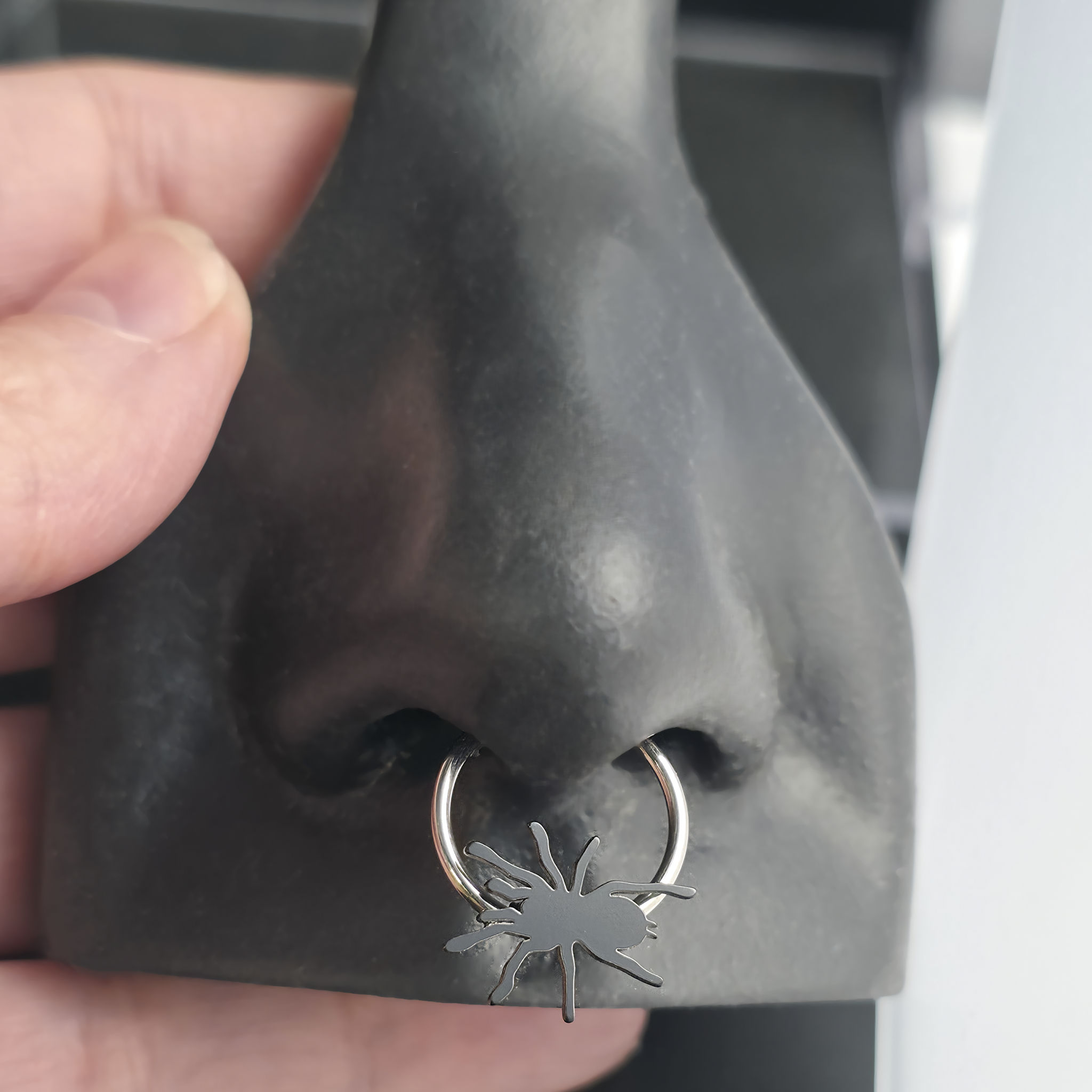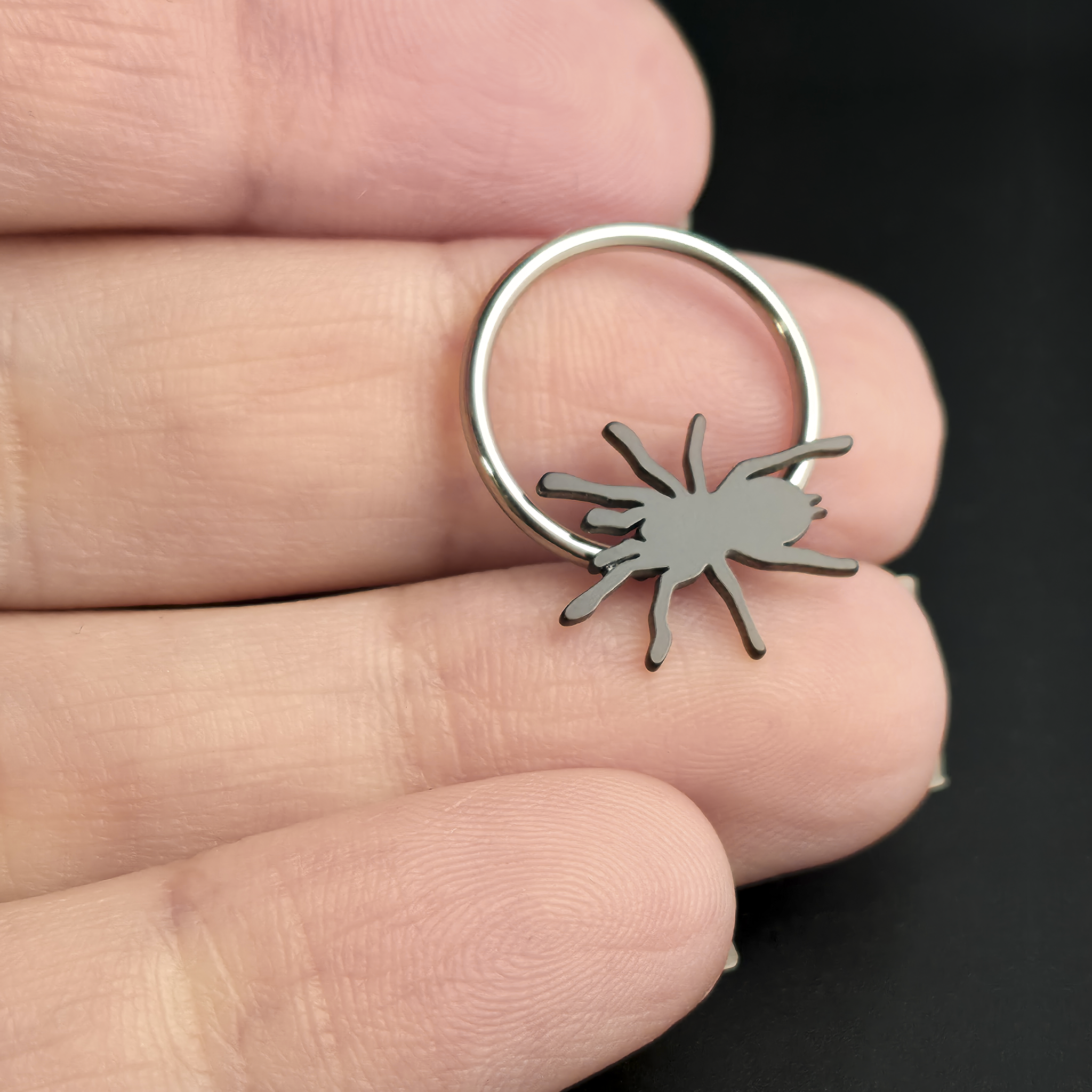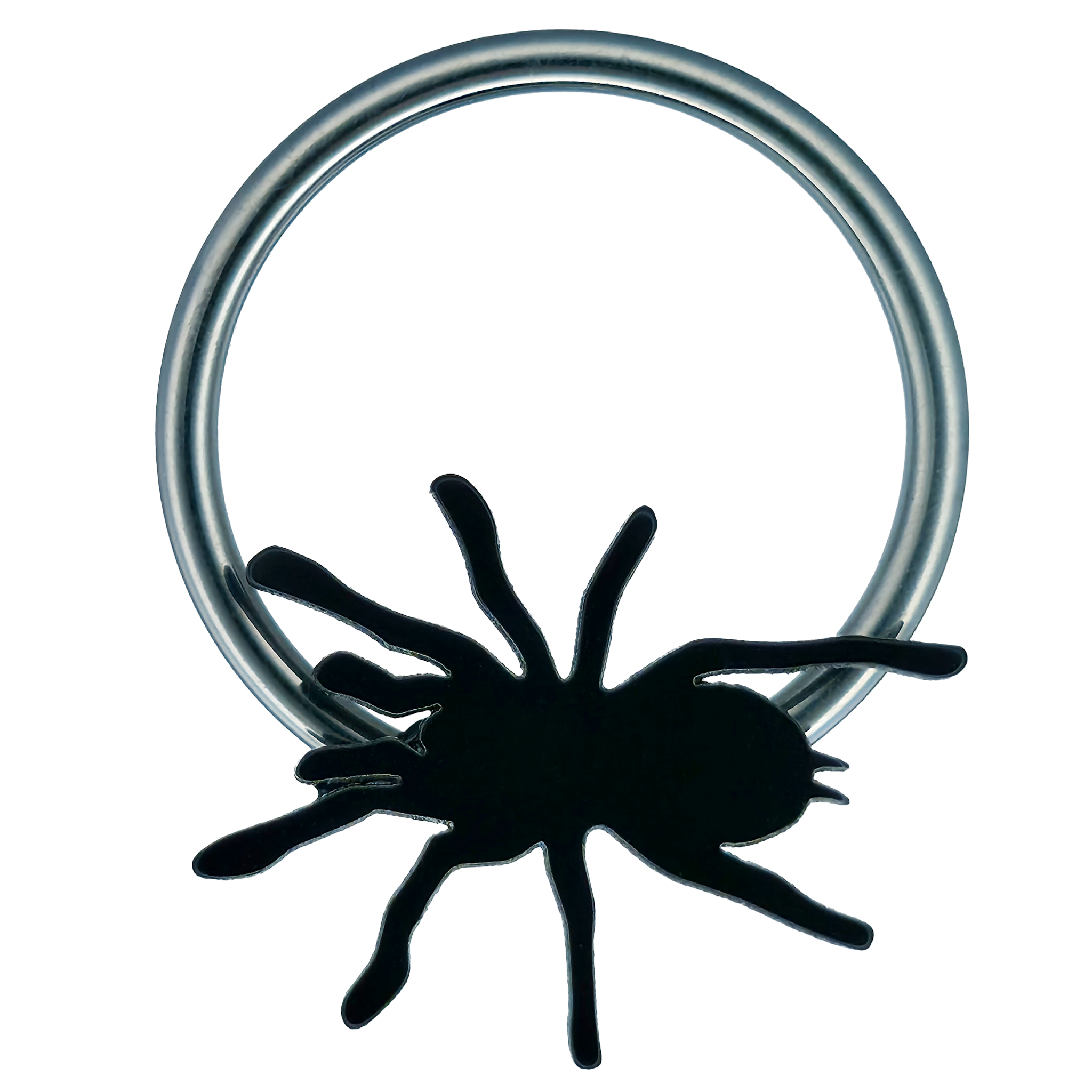 For those who don't flinch at eight legs. This tiny tarantula design features an unmistakable shape, paired with a titanium hoop for comfortable wear. Crafted one at a time in sterling silver and plated with a ceramic e-coating, it’s built to last (and to be stared at).