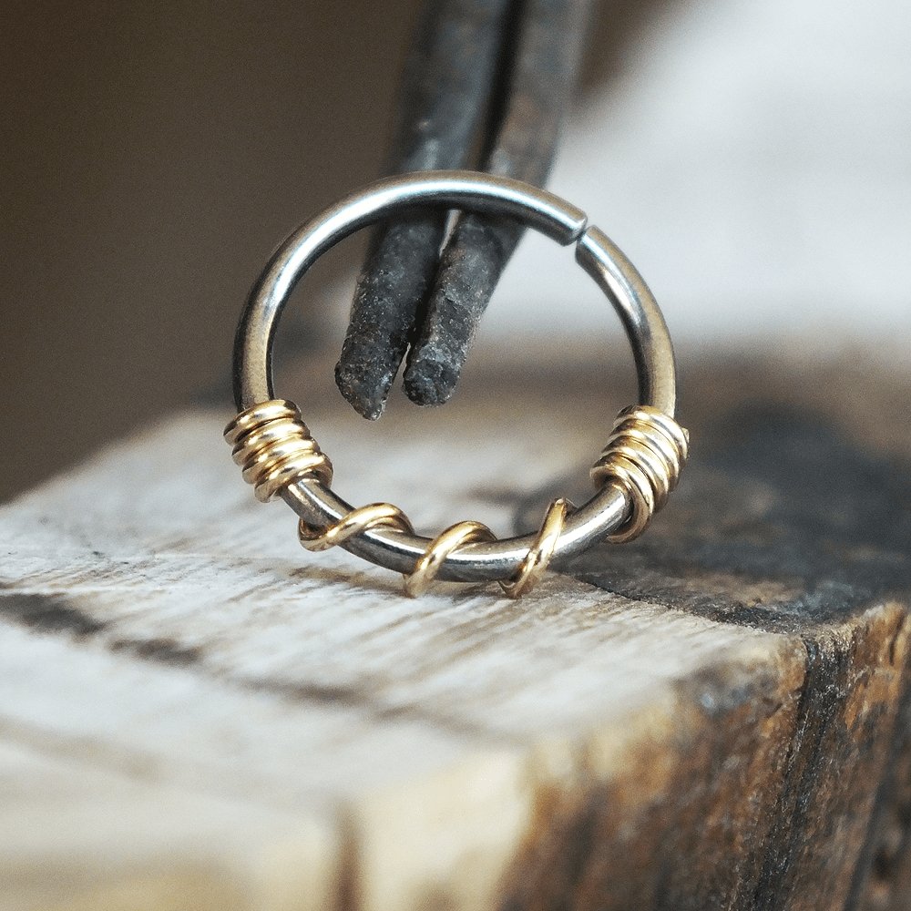 This niobium nose hoop features a 14/20 yellow gold-filled twist. It also makes a great earring. It's completely nickel free!
